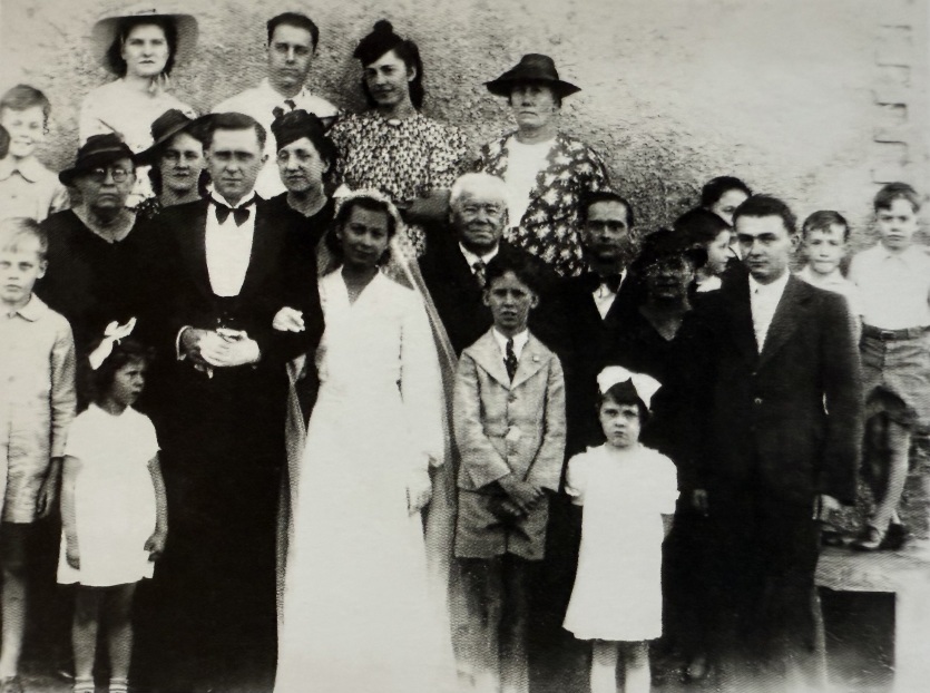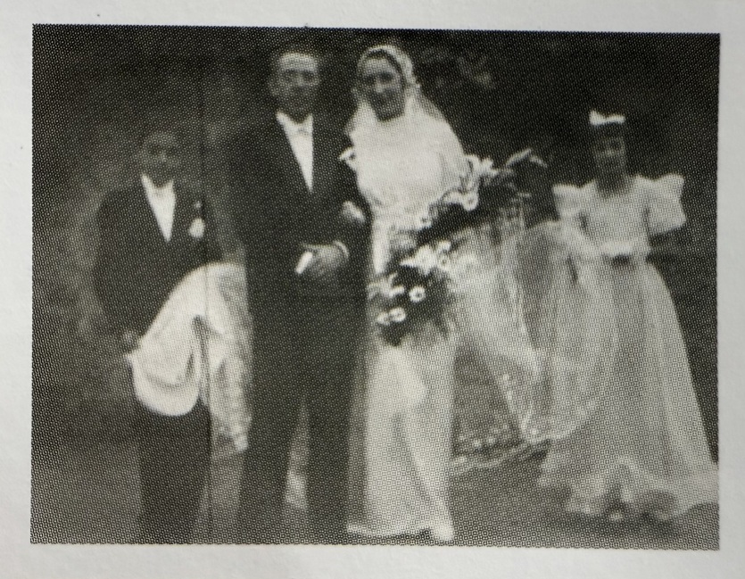 Mariage de Pierre Marcel Galinié et d'Augustine André. Julienne Galinié (chapeau noir et lunettes rondes) est la petite-fille du forçat et la mère du marié, Pierre Galinié."Pierre prend la succession de son père Jean-Marie et devient lui aussi cultivateur et éleveur. Il agrandit la propriété en achetant des lots voisins, gagne des prix à la foire agricole, diversifie son activité avec le transport, le chalandage et le commerce. Il épouse Angélina Reveillon, le 12 janvier 1882, dont le père est arrivé en Nouvelle-Calédonie au même titre que Jean-Marie : il aurait usé de fausse monnaie.