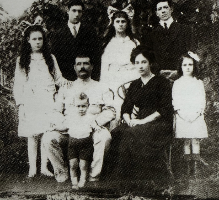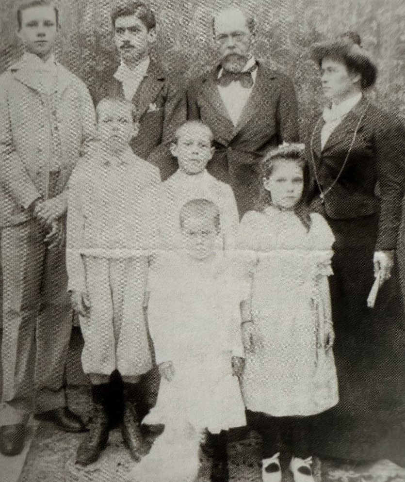 Angèle et Charles Ohlen avec six de leurs sept enfants. De gauche à droite: Georges et Eugène, les parents, puis au premier rang Emile, Charles, Fanny et Henri. La photo a été prise vers 1902-1903." Pierre et Georges, les deux fils du surveillant, épousent deux sœurs, Elise Ida et Blanche Jouvent, avant de s'installer aux Nouvelles-Hébrides. Pierre ne s'y plaît pas et quitte l'archipel pour le Maroc.