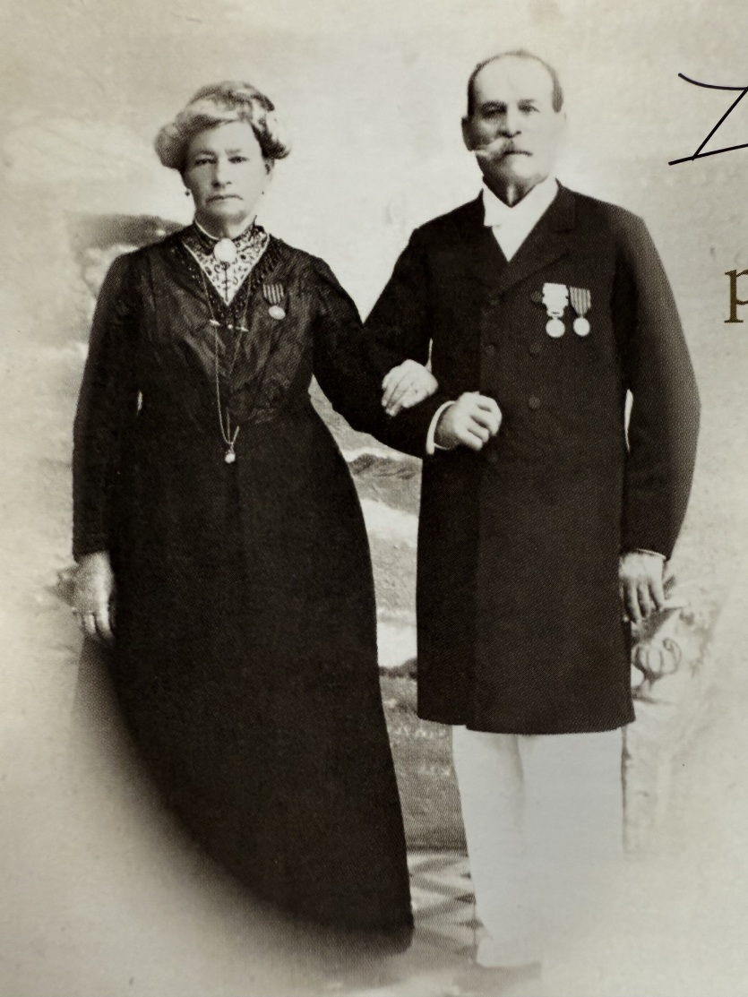 Le surveillant militaire Paul Marcelin Rolland et son épouse Anais. Cette photo a été prise en 1913 à Toulon. Ils ont reçu tous les deux, à l'occasion des commémorations du 14-Juillet, la médaille des batailles de Sedan pendant lesquelles ils ont été faits prisonniers en 1870.À cette occasion, ils envoient une photo d'eux à leurs enfants restés en Calédonie. Nous ignorons s'ils reviennent ou pas. Lorsque Anaïs meurt à Toulon en 1918, elle est déclarée veuve mais nous ne savons ni où ni quand son époux est décédé. "