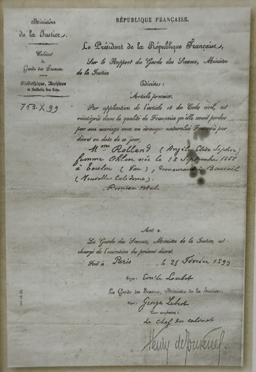 Certificat de réintégration. En 1899, Angèle est réintégrée dans la nationalité française qu'elle avait perdue en épousant Charles Ohlen, un Allemand. Son époux a de son côté obtenu la nationalité française la même année.Angèle et Charles Hermann vont ensuite partir vivre aux Nouvelles-Hébrides.