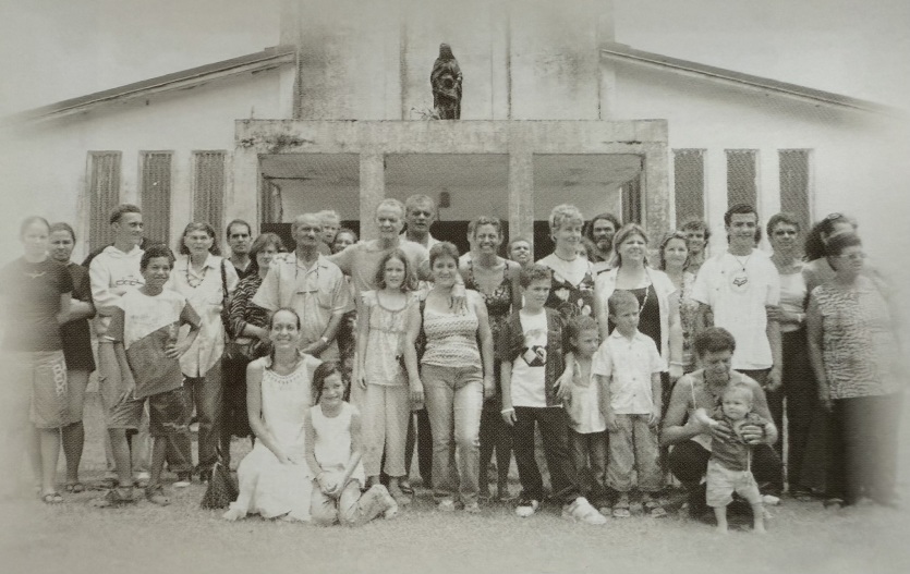 Photo de famille prise lors du baptême d'Hervé (cinquième génération) en avril 2010 devant la chapelle de Monéo (Ponérihouen), où son grand-père et ses grands-oncles avaient été baptisés quatre-vingts ans plus tôt." Seuls mon oncle Yves et mon père Hervé ont connu le grand-père Michel. Tous les soirs, en rentrant de la mine, il les prenait sur ses genoux et leur chantait des chansons bretonnes, quelquefois en breton. Il leur racontait, un peu mélancolique, la Bretagne et ses parents qu'il n'aura jamais revus. Ils me disaient de lui que c'était un pur Breton avec les pommettes bien roses. Mes cousins chantent très souvent " Oh mât hissons les voiles // Je vois briller l'étoile, l'étoile du matelot ". À chaque réunion de famille, à chaque fête, nous la chantons encore en mémoire de lui. "