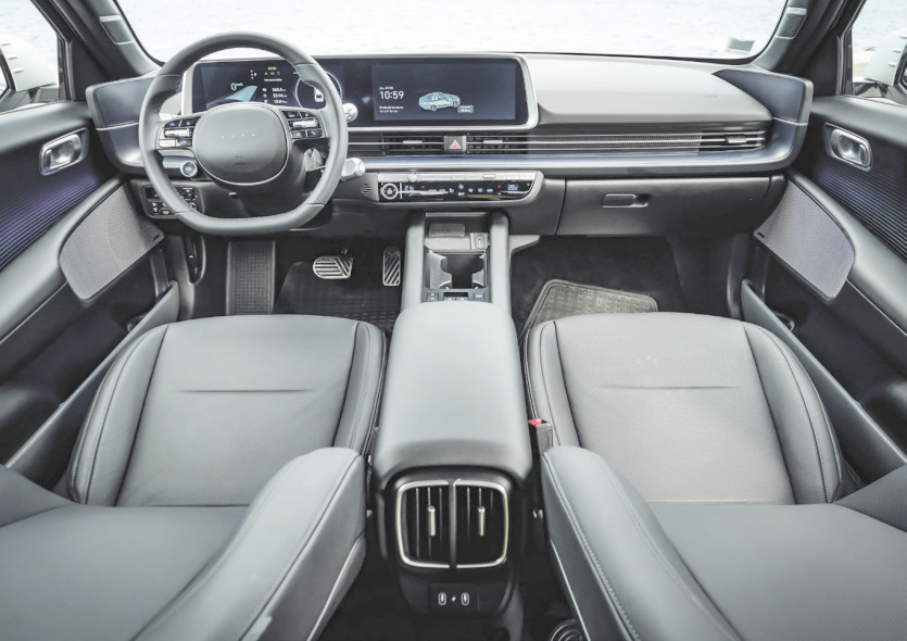 Les éclairages d'ambiance largement diffusés dans les contre-portes qui sont dépourvues de commandes, le grand écran incurvé qui intègre les compteurs numériques de 12,3″ et l'écran multimédia tactile de 12,3″, le volant interactif avec ses quatre pixels lumineux qui indiquent le statut de différentes fonctions du véhicule (4 points en morse désignent le H, comme celui de Hyundai), la console centrale type "Cockpit" et les sièges avant étudiés pour offrir le maximum de confort pendant l'attente d'une phase de rechargement, sont autant d'éléments qui inspirent le rêve d'une mobilité intergalactique.
