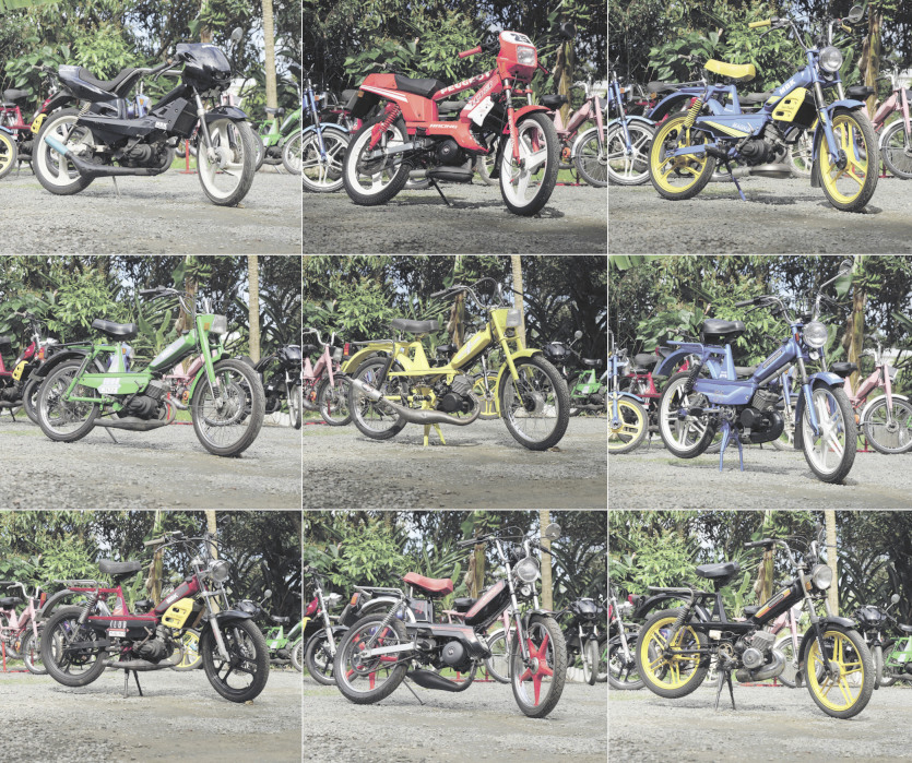 De gauche à droite et haut en bas : MBK 51 XR Magnum Racing ; Peugeot 103 RCX Racing ; MBK51 Magnum ; MBK 51 Club Jazz ; Motobécane 51 Jazz ; Motobécane 51 Super ; MBK 51 Club Salsa ; Peugeot 103 SPX ; Motobécane 51 Super. Photo Jean-Marie Chatelain / AMBMERCI DE VOUS IDENTIFIER