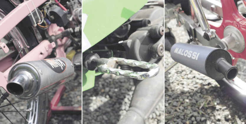 Pas de mobylette sans béquille. Heureusement… Photo Jean-Marie Chatelain / AMBEn face, plusieurs 103, la féroce concurrente des 51 : et d’abord la 103 RCX Racing, qui appartient également à Nicolas ; ensuite, la 103 SPX et la 103 Vogue, avec son phare carré et son guidon atypique pour la série, qui permettait comme ses devancières les 101 et 102, de rapprocher les poignées vers le centre du cadre ; enfin, Jean-Yves possède deux très rares GL10 modèle fille (avec le réservoir en dessous de la selle), un Solex 3800, une remarquable Motobécane Chaudron de 1958… Au total, sa flotte comprend une quinzaine d’exemplaires.