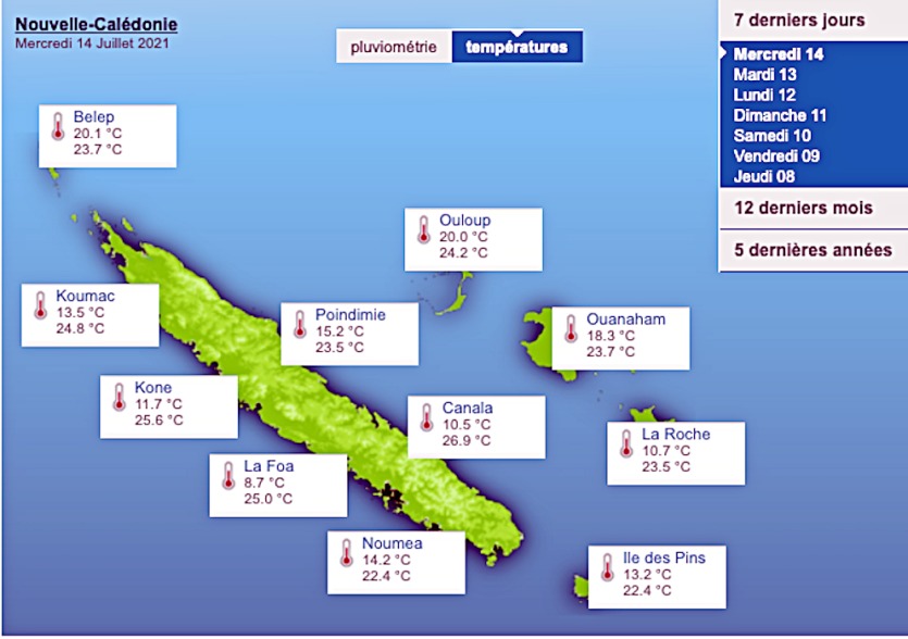 - Si aucun record de froid n'a été battu, les températures ont brusquement chuté mardi. Rien de bien étonnant, "c'est l'hiver", rappelle Météo-France.Ça n'aura échappé à personne, notamment dans le sud de la côte Ouest et le Grand Nouméa : il a fait froid mardi soir et mercredi matin. Avec 8,7 °C enregistré à La Foa, 10,7 °C à Maré et même un petit 11 °C à Koné, la nuit de mardi à mercredi "a piqué un peu", comme le confirmeIl vous reste 86% de l'article à découvrir.Cet article est réservé aux abonnés.