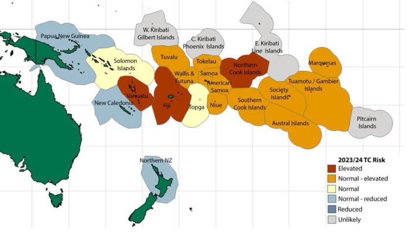 Cette carte, établie par les météorologues du centre néo-zélandais (Niwa), montre le risque de cyclone tropical pour la saison 2023-2024. Source NiwaPourquoi la Nouvelle-Calédonie devrait être moins exposée aux phénomènes ?