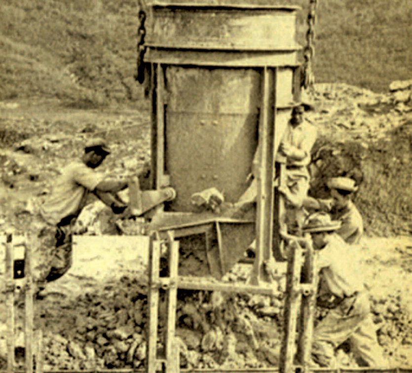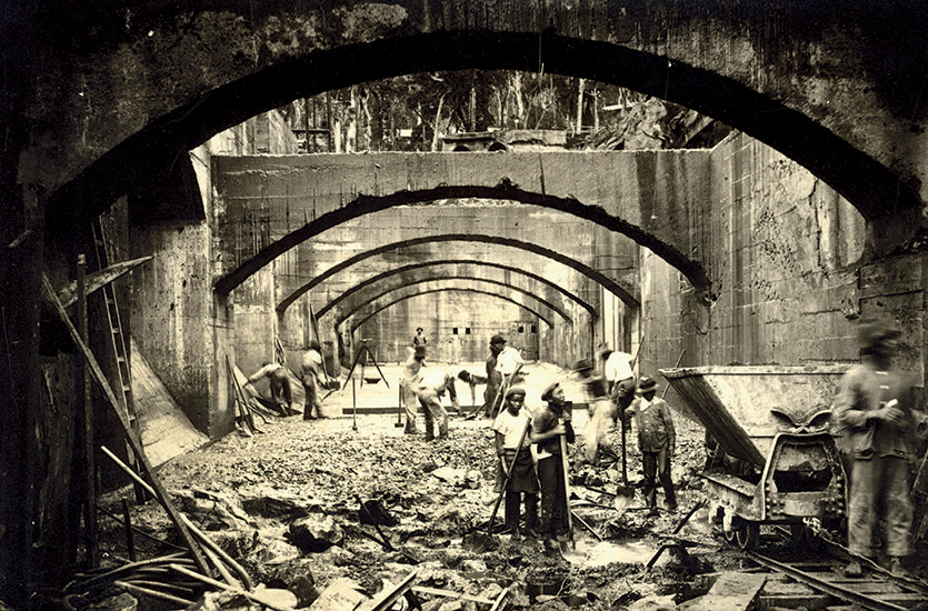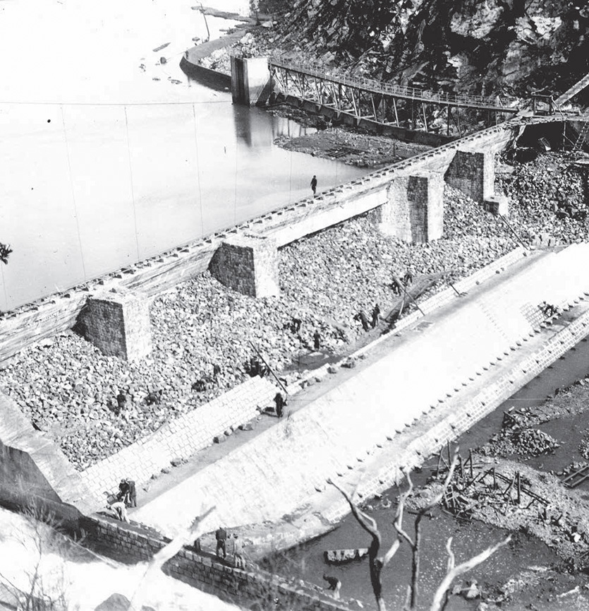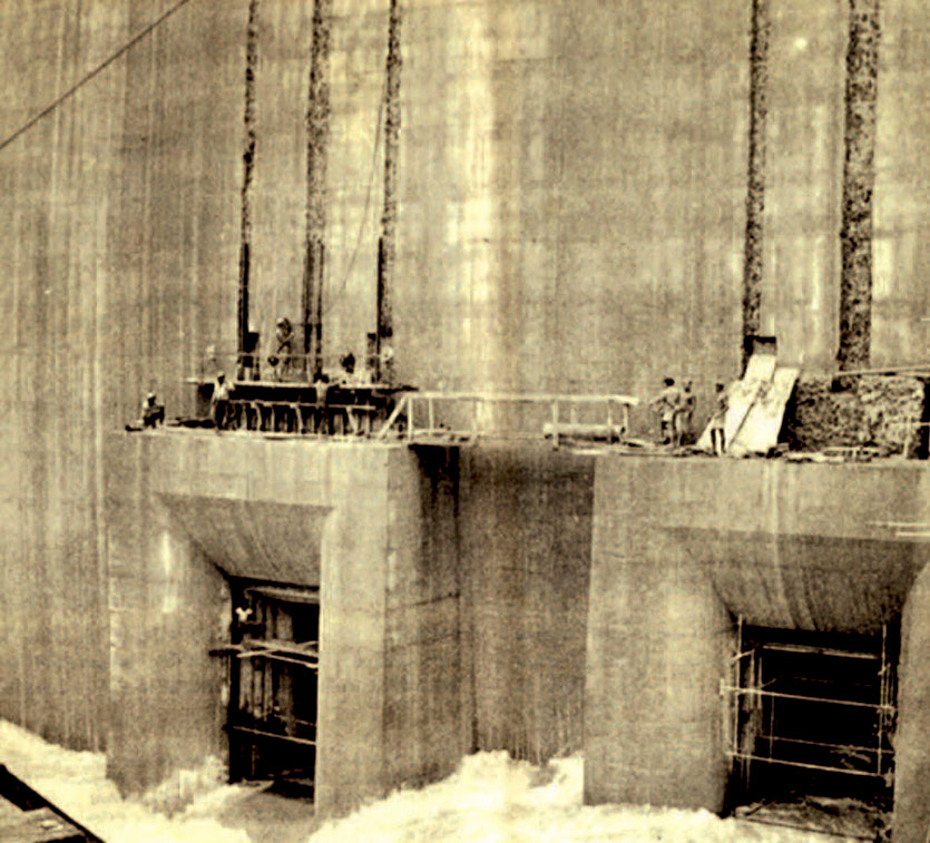 Les deux vidanges de fin, vues d’amont. Les vannes nesont pas encore en place. Sous les pieds des ouvriers,les flots se précipitent dans les ouvertures étroites.Photo Le Mémorial calédonien