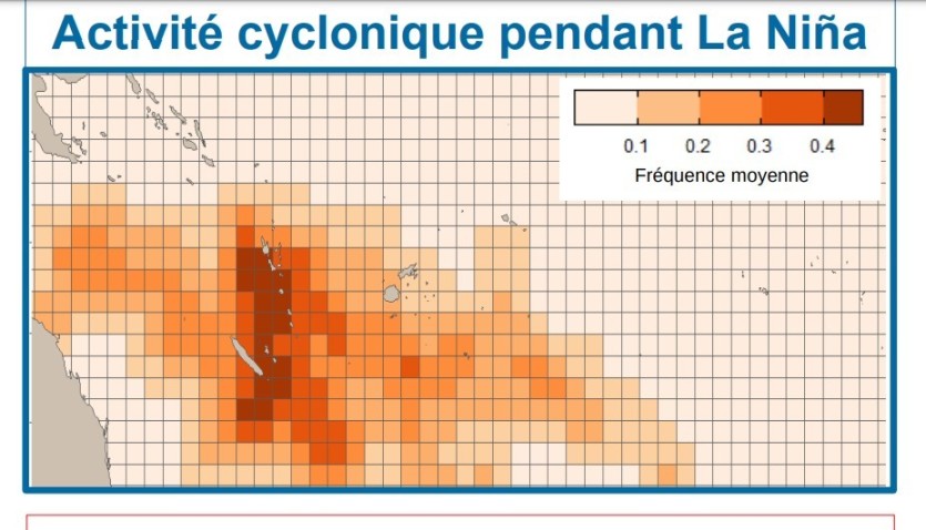 Durant La Niña, le risque est accru dans la région du Caillou et du Vanuatu. Source Météo FranceEn résumé, dans ce contexte, l’activité cyclonique devrait être décalée à l’extrême ouest du bassin Pacifique sud et devrait ainsi être "normale à accrue" dans la région comprise de la Papouasie Nouvelle-Guinée jusqu’au nord de la Nouvelle-Zélande (qui englobe donc également la Nouvelle-Calédonie). À l’inverse, l’activité devrait plutôt être réduite des Fidji jusqu’à la Polynésie française.