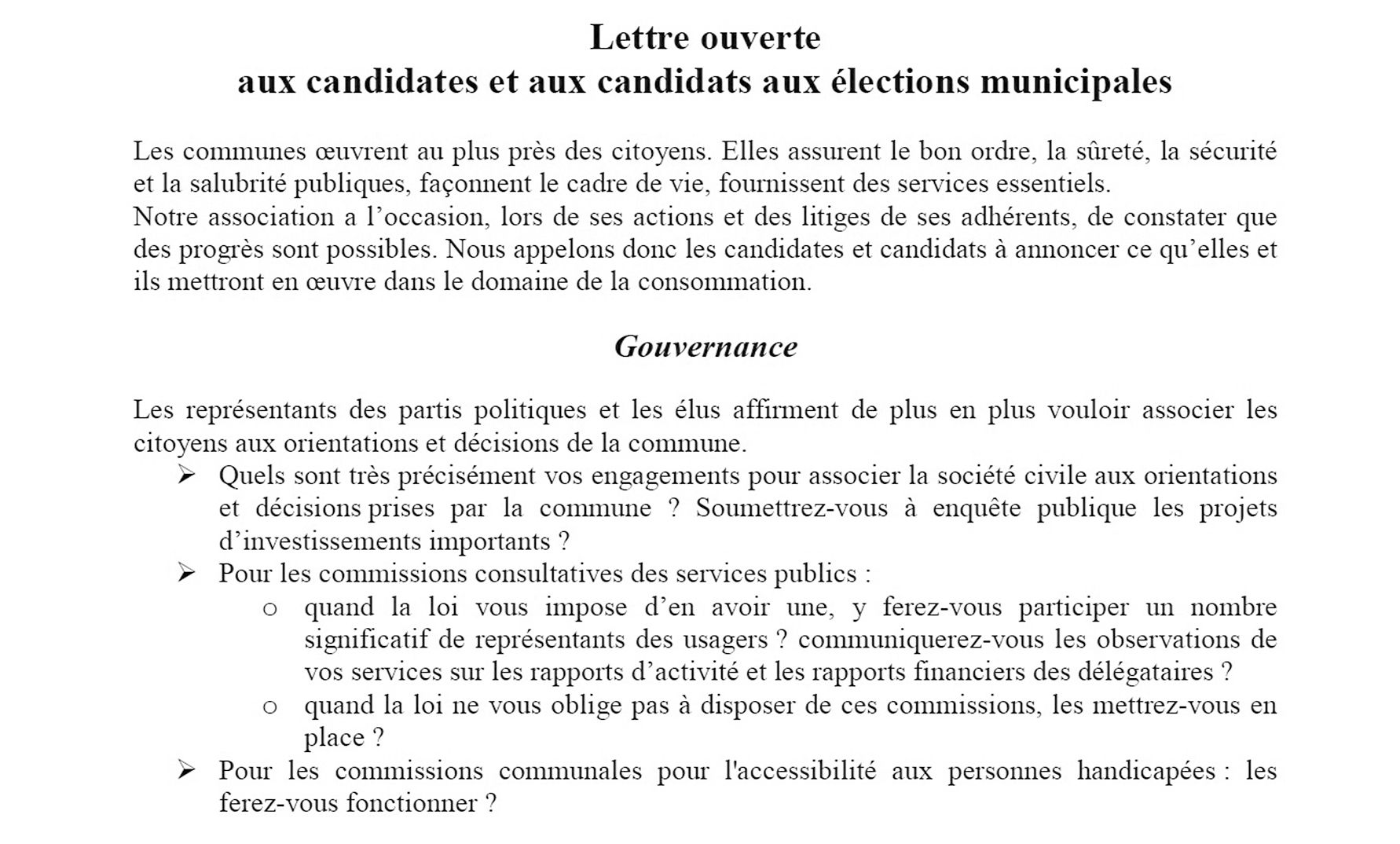 - MUNICIPALES. Dans un courrier signé par Luce Lorenzin, sa présidente, l’UFC-Que choisir a souhaité interpeller les candidats aux élections municipales en leur soumettant une série de questions. Une lettre ouverte qui appelle « les candidats à annoncer ce qu’ils comptent mettre en œIl vous reste 76% de l'article à découvrir.Cet article est réservé aux abonnés.