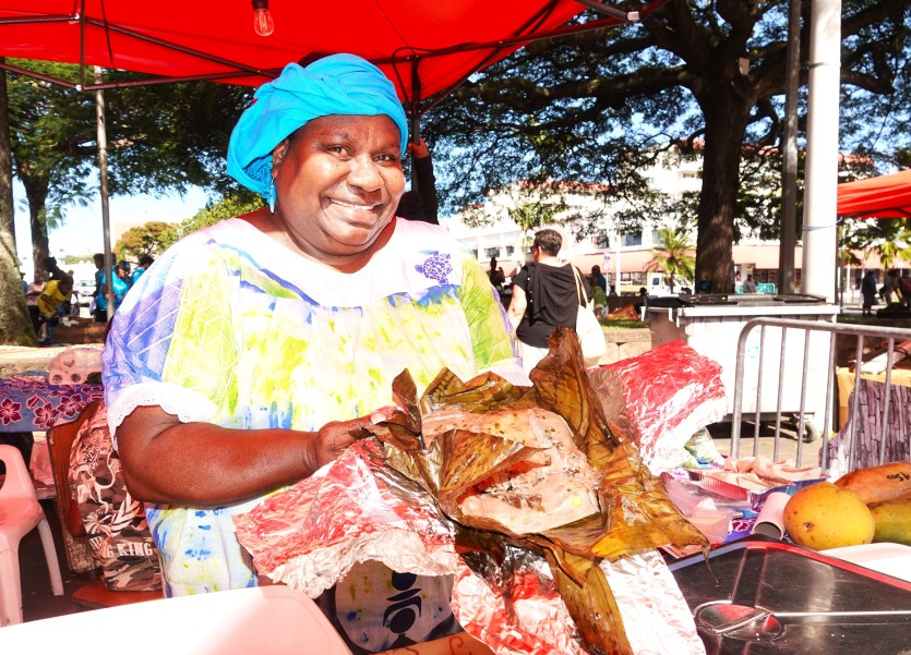 Cette exposante de Koné propose des plats "hybrides" typiques du Vanuatu et de la province Nord. Photo Anthony TejeroPour le plus grand bonheur des exposants particulièrement nombreux. Rien que pour la commune de Houaïlou, une centaine de personnes a fait le déplacement, certains en minibus, pour l’occasion. "C’est assez exceptionnel. Ce rendez-vous, qui réunit plusieurs associations de la commune, nous permet d’avoir un petit pécule, mais aussi de sortir de chez nous et de pouvoir échanger, glisse Élizabeth, à la tête de l’association Djiirho, ravie de montrer l’ampleur de l’offre disponible. C’est une très bonne période, notamment pour les taros et les ignames, dont nous avons terminé les récoltes. Il y a de bonnes affaires et ça marche très bien."