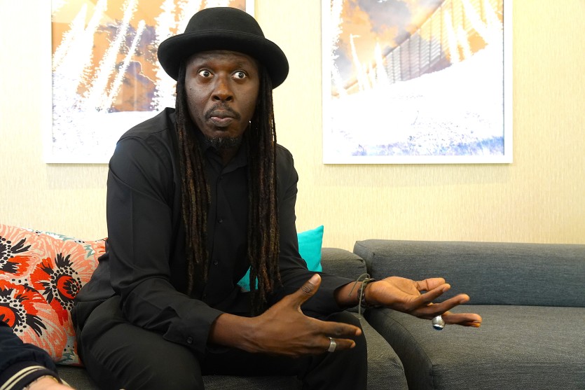 Faada Freddy est arrivé par avion directement du Sénégal. Photo Anthony Tejero"Je ne suis pas avec mes musiciens, donc j’utiliserai seulement une guitare sur scène. Je ferai un peu de percussions corporelles et j’utiliserai principalement la voix comme instrument pour partager avec le public mon expérience de la musique organique, que ce soit les voix diphoniques, ou les harmonies, ou simplement le beatbox. Avec la musique organique, on peut directement accéder à la musique thérapeutique, parce que non seulement c’est une vibration de l’âme qui est portée par le corps, mais aussi on peut ressentir les énergies et les transcrire tout de suite. Parfois, je me permets même de demander au public de me donner trois notes et à partir de là, j’essaie de raconter une histoire qui me correspond. C’est ça l’avantage de la musique organique. Tu peux en faire ce que tu veux. J’aime cette liberté.