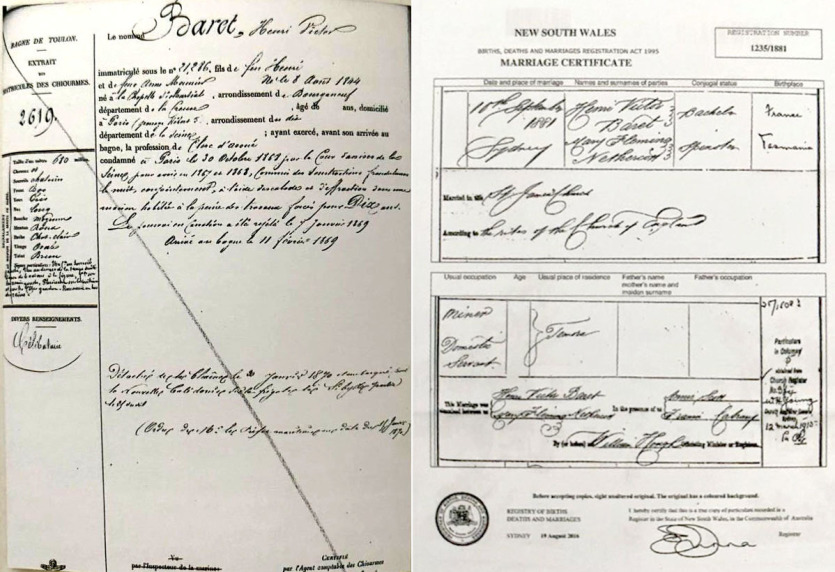 A gauche : un extrait du registre des chiourmes. Henri Baret porte le numéro de matricule 2619. A droite : l’acte de mariage entre Henri et Mary, en 1881. Les descendants ignorent ce que leur aïeul a fait dans les trois ans qui séparent son arrivée en Australie et son mariage à Sydney. Photo DRDans l’acte de mariage, il se présente comme mineur mais je n’y crois pas une seconde ! Il était en fait restaurateur. Nous le savons car, pendant sept années, entre 1881 et 1887, un procès va l’opposer à monsieur Deutscher, un riche propriétaire qui avait créé une sorte de barrage sur la rivière le long de son terrain, lequel avait, par un jour de crue, inondé le local de mon aïeul.