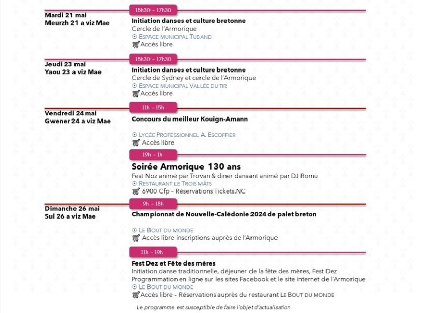 Et afin de célébrer comme il se doit ses 130 ans d’existence, les bénévoles de l’association ont décidé de relayer localement la Semaine de la Bretagne, avec tout un florilège d’activités du 17 au 26 mai, à Nouméa.