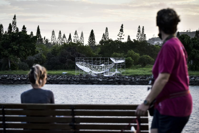 Cette oeuvre lumineuse représentant une baleine sur l'îlot Sainte-Marie, avait été exposée en 2022.Entre 2021 et 2022, le collectif avait proposé une œuvre remarquée Flying whales, qui représentait une baleine et son baleineau, qui avait été installée à Genève, en Suisse, dans le cadre du festival Geneva Lux, avant d’être ensuite présentée aux Calédoniens sur l’îlot artificiel. Des animaux, ambassadeurs "de poésie et de partage, telle une constellation qui ramène à l’essentiel".