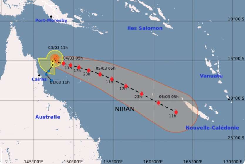 - Julien Mazzoni | Crée le 03.03.2021 à 20h25 | Mis à jour le 03.03.2021 à 20h43ImprimerDes rafales à 200 km/h, de grosses pluies et une forte houle sont à craindre. Illustration Météo-France NCNiran se renforce et se rapproche. Elle devrait devenir cyclone dans les prochaines heures. La préalerte sera déclenchée dès ce jeudi matin. Petit rappel des consignes à destination des travailleurs.