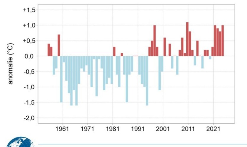 Écart à la normale 1991-2020 des températures moyennes des mois de décembre en Nouvelle-Calédonie de 1955 à 2024. Source Météo France NCDans le détail, la température maximale mensuelle est de 30,4°C en moyenne dans le pays, ce qui représente un écart à la normale de + 0,7°C. Au niveau des stations, les températures maximales mensuelles sont comprises entre 27°C à Goro ancienne pépinière (Prony Ressources, à Yaté) et 33,8°C à La Tontouta (soit + 2,3°C par rapport à la normale dans ce secteur de Païta).