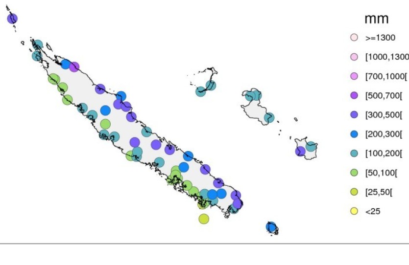 Les anomalies mensuelles de précipitations varient entre -32 % à Boulari, au Mont-Dore (avec 67,1 mm pour une normale de 98,6 mm) et + 216 % à