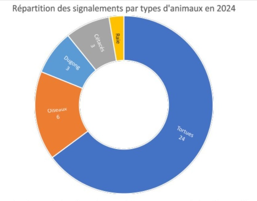 Dans le cadre de conventions signées avec les provinces Sud et Nord, le Coss apporte désormais son concours "à la préservation de la faune marine". Ainsi, dès lors qu’une espèce sensible (dugong, tortue, baleine, requin, etc.) est signalée blessée, échouée ou en détresse, le centre récolte toutes les informations utiles et alerte par message les services ou personnes en mesure de porter assistance. Le centre a reçu 37 signalements en 2024 (contre 34 en 2023 et 12 en 2022). Un chiffre en hausse qui concerne en très grande majorité la Province Sud (32 cas sur 37).