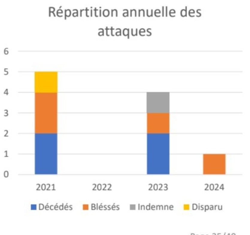 Du côté des attaques, une seule a été recensée en 2024, à Pouébo. La victime est un adolescent qui pratiquait la chasse sous-marine au niveau du récif lorsqu’il a été mordu. Evacué en urgence, le jeune homme a dû subir l’amputation de sa jambe.