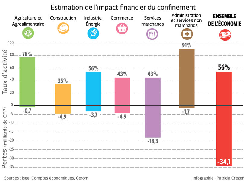 - Gros plan - CRISE DU CORONAVIRUSUne note publiée hier matin par l’Isee, l’IEOM et l’AFD estime que le « choc direct » du confinement pourrait causer une forte diminution de la richesse produite par l’économie calédonienne en 2020 (-3,6 points de produit intérieur brut, PIB). Les effets se feront sentir à court comme à long terme « sur le tissu économique et les finances publiques ».Le « choc direct » du confinement : - 3,6 points de PIB ? Le produit intérieur brut 2020, soit la somme des richesses créées par l’économie calédonienne au cours de l’année, pourrait perdre 3,6 points à cause du « choc direct » créé par le confinement, selon une estimation publiIl vous reste 97% de l'article à découvrir.Cet article est réservé aux abonnés.