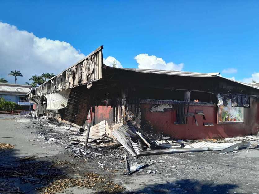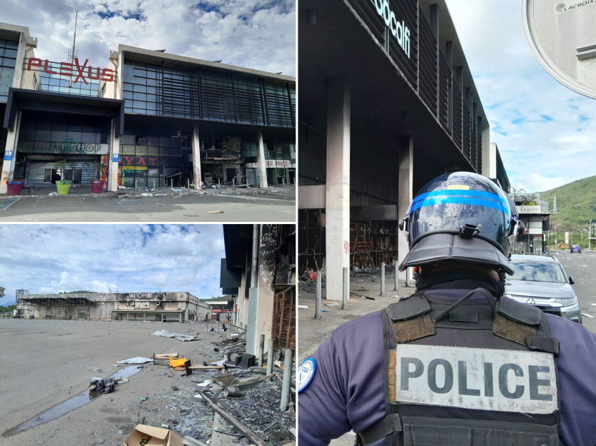 Levée des barrages par les gendarmes à l’entrée du quartier de Rivière-Salée. Photo Anthony Tejero[11h50] A Ducos, les forces de l’ordre sont stationnées vers le rond-point de Papeete pour protéger la zone des "pillards qui traînent encore" dans le quartier. Le centre commercial du Plexus comme les complexes de Ducos Factory et de Monsieur Bricolage ont été détruits par les flammes.