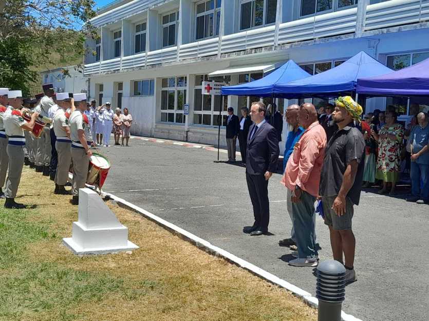 La stèle du Bataillon mixte du Pacifique est dévoilée. Photo Anthony Tejero[10h30] Sébastien Lecornu vient d’arriver à la pointe de l’Artillerie où il doit baptiser le quartier " Bataillon mixte du Pacifique " puis le bâtiment de la direction de l’administration sanitaire et sociale " Acôma Nerhon".