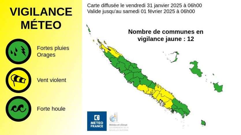 - A.T. | Crée le 31.01.2025 à 07h43 | Mis à jour le 31.01.2025 à 07h43ImprimerSource Météo FranceDouze communes de la Grande Terre sont placées, ce vendredi 31 janvier, en vigilance jaune aux vents forts, qui devraient souffler jusqu'à 40 noeuds dans l'après-midi. La prudence est de mise notamment dans les communes encore placées en risque élevé à tré élevé de feux de forêt comme Nouméa.