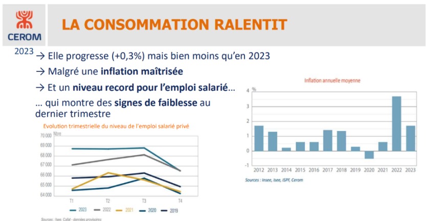 - | Crée le 07.05.2025 à 08h59 | Mis à jour le 12.05.2025 à 10h24ImprimerEn 2023, l'emploi salarié dans le secteur privé a atteint un niveau record. La consommation, elle, a ralenti. Infographie Cerom