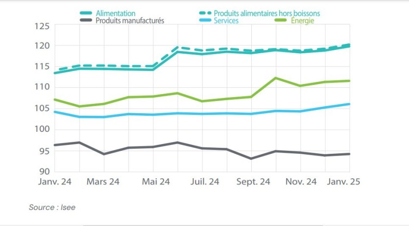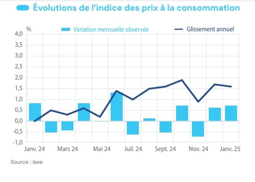 L’augmentation des prix de l’alimentation s’accélère, avec + 1,5 % en janvier, après + 0,6 % en décembre 2024. Cette hausse est directement imputable aux prix des légumes qui progressent de 11,4 % ce mois-ci. "Les conditions climatiques, sécheresse et températures élevées, ont affecté les cultures (maraîchères notamment), réduisant ainsi la production locale", indique l’Isee (Institut de la statistique et des études économiques).