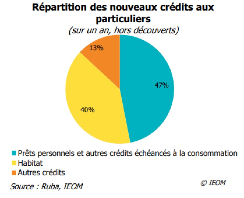 La majorité des prêts aux particuliers concernent ceux à la consommation puis à l’habitat. Infographie IEOM