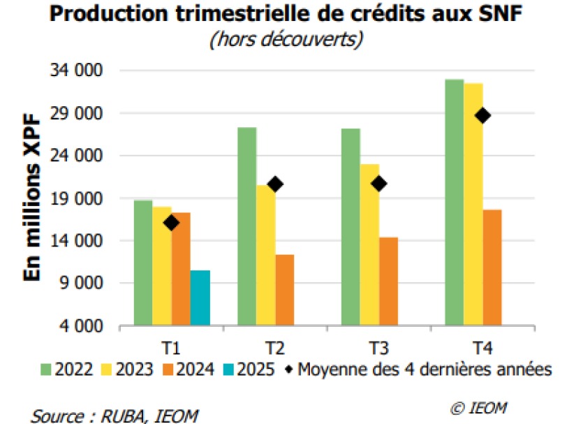 Dans sa dernière publication, l’IEOM, Institution d’émission d’Outre-mer, fait le point sur la production totale de crédits au premier trimestre 2025 en Nouvelle-Calédonie, "alors que l’économie est confrontée à une absence de perspectives". Résultat : la production de crédits hors découverts "recule significativement". Selon l’IEOM, cette tendance baissière s’explique notamment par un recul des crédits de trésorerie échéancée aux entreprises et des crédits à la consommation aux particuliers. "La production de crédits s’établit à un niveau historiquement bas (17,1 milliards de francs)."