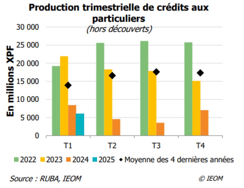 La production de crédits aux particuliers baisse encore au premier trimestre 2025 par rapport au dernier de 2024 pour s’établir à 6 milliards de francs. Infographie IEOM