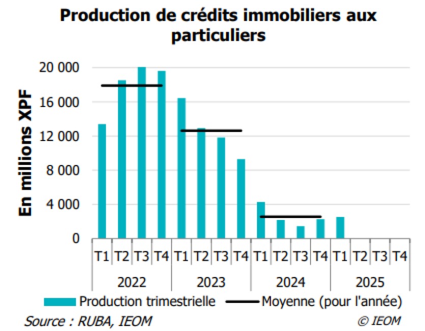 La production de prêts immobiliers aux particuliers, qui avait déjà largement chuté début 2024, reste à un niveau très faible. Infographie IEOM