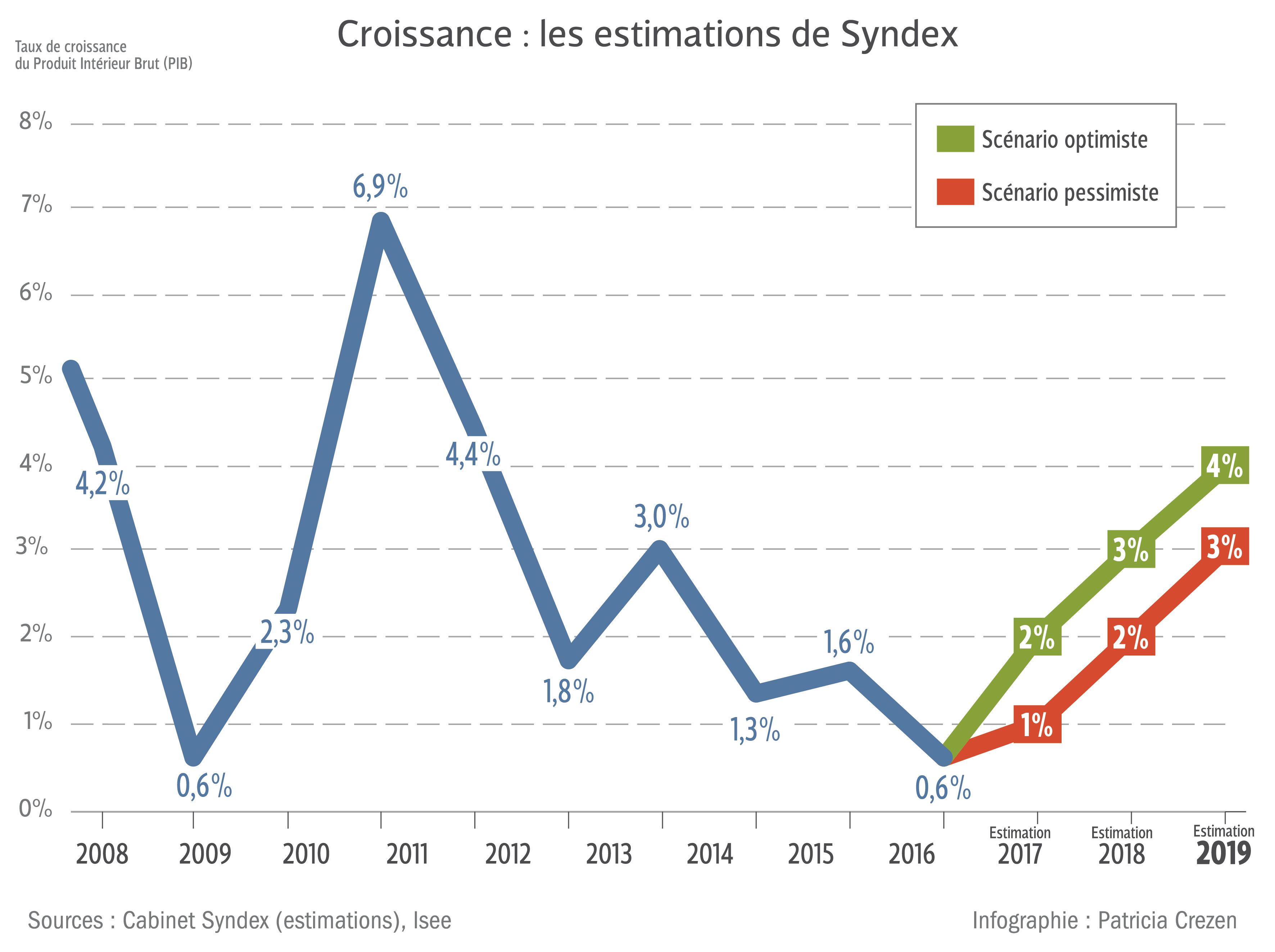 - MACROÉCONOMIE. Commandée par le Conseil du dialogue social, réalisée par le cabinet privé Syndex et utilisée par le gouvernement pour construire son budget 2019, une « note de conjoncture », annonce une année faste.Les années de 2011 à 2016 « apparaissent sans aucun doute comme des années de crise économique », estime le cabinet privé Syndex, au regard du « tournant » qui a suivi, et surtout de « la sortie de crise [qui] s’annonce ». À en croire les analystes mandatés par le Conseil duIl vous reste 93% de l'article à découvrir.Cet article est réservé aux abonnés.