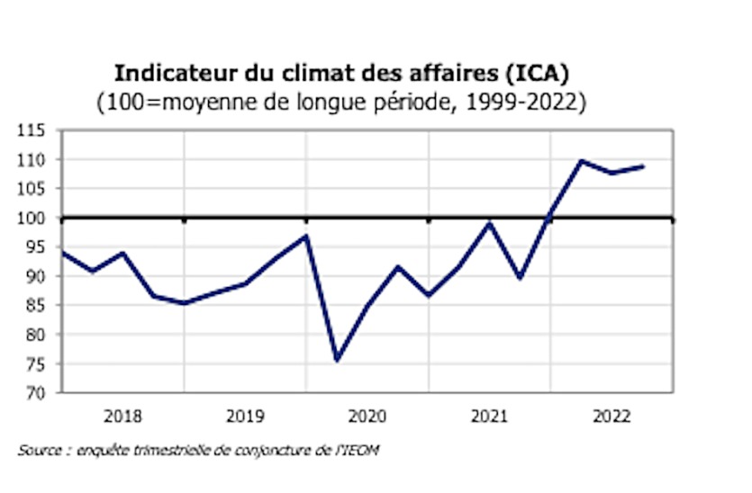 - L'indicateur du climat des affaires continue de progresser. Un point positif, à nuancer avec une hausse quasi inévitable des prix...Dans sa note sur les "tendances conjoncturelles du 3e trimestre 2022, l'Institut d'émission d'outre-mer confirme une nouvelle hausse du climat des affaires au troisième trimestre. Il s'établit à 108,7 points. Cet indicateur est réalisé "auprès d'un échantillon de près de 200 entreprisesIl vous reste 86% de l'article à découvrir.Cet article est réservé aux abonnés.