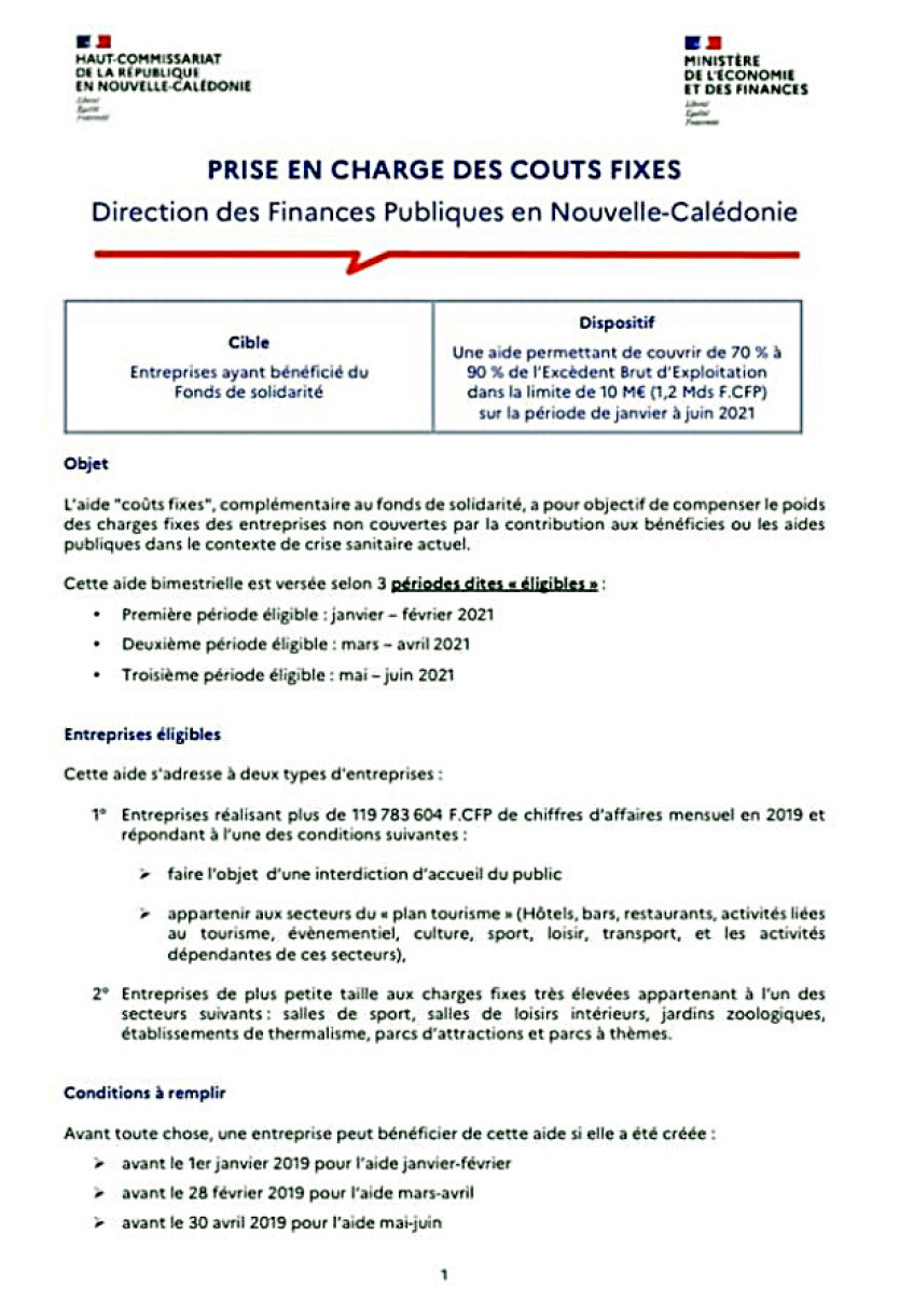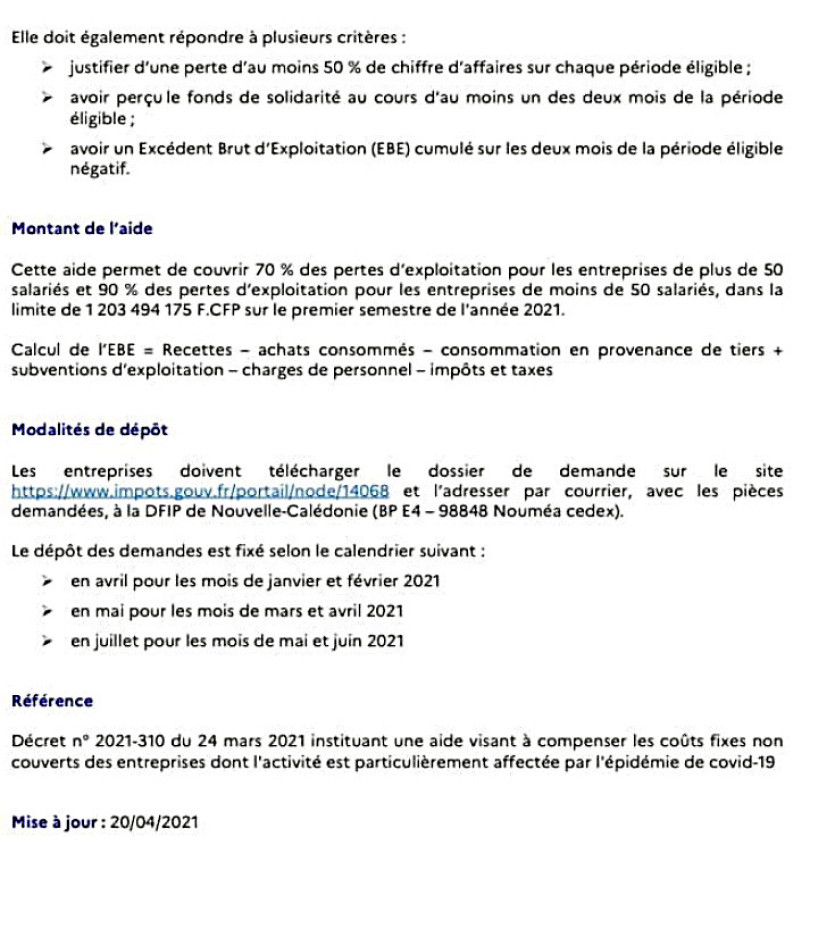 "Dans le cadre des discussions avec l'Etat nous avions sollicité que l'aide dite " coûts fixes " du plan France relance soit applicable en Nouvelle-Calédonie. C'est désormais possible. Cette aide permet de couvrir 70 % des pertes d'exploitation pour les entreprises de plus de 50 salariés et 90 % des pertes d'exploitation pour les entreprises de moins de 50 salariés, dans la limite de 1 203 494 175 F.CFP sur le premier semestre de l'année 2021."