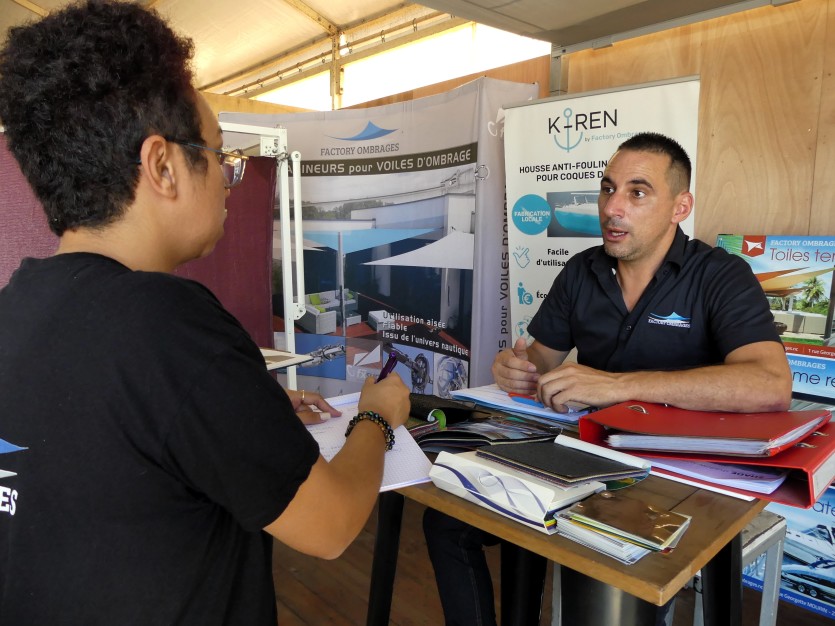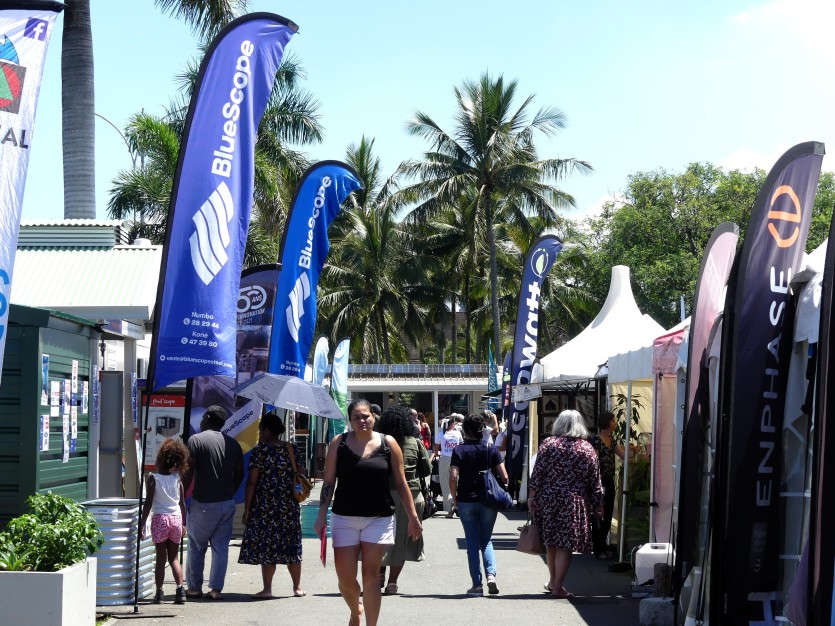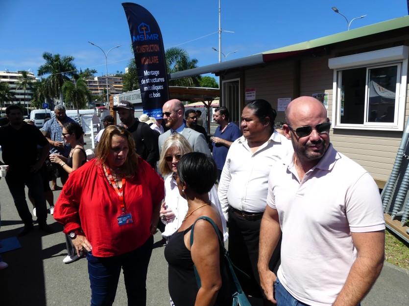 Élizabeth Rivière, présidente de la Chambre de métiers et de l'artisanat, a fait le tour des exposants, ce vendredi matin, accompagnée d’élus du gouvernement et de la mairie de Nouméa. Photo Baptiste GouretReste que le retour d’une activité de niveau d’avant-crise n’est pas pour demain. "Depuis le deuxième référendum, on est affecté par l’instabilité politique de ce pays", constate Noé Bertram, qui a lancé sa boîte en 2005. En 2017, "je faisais travailler 75 personnes". Il en embauche désormais 25. "On est sur un marché de niche haut de gamme, nos principaux clients ont la capacité d’investir ailleurs, et c’est ce qu’ils ont fait", regrette l’entrepreneur.