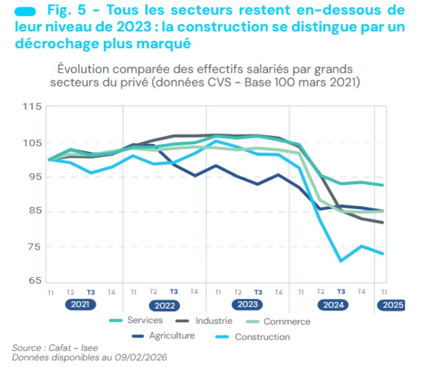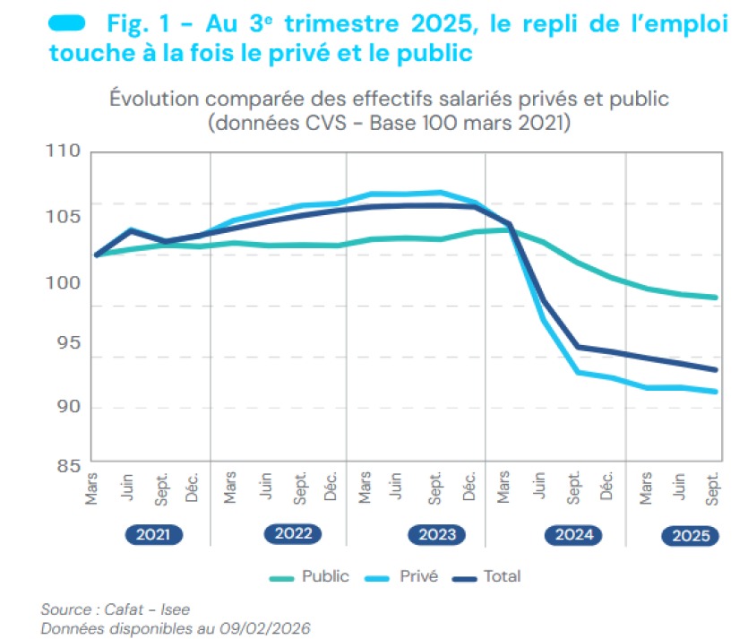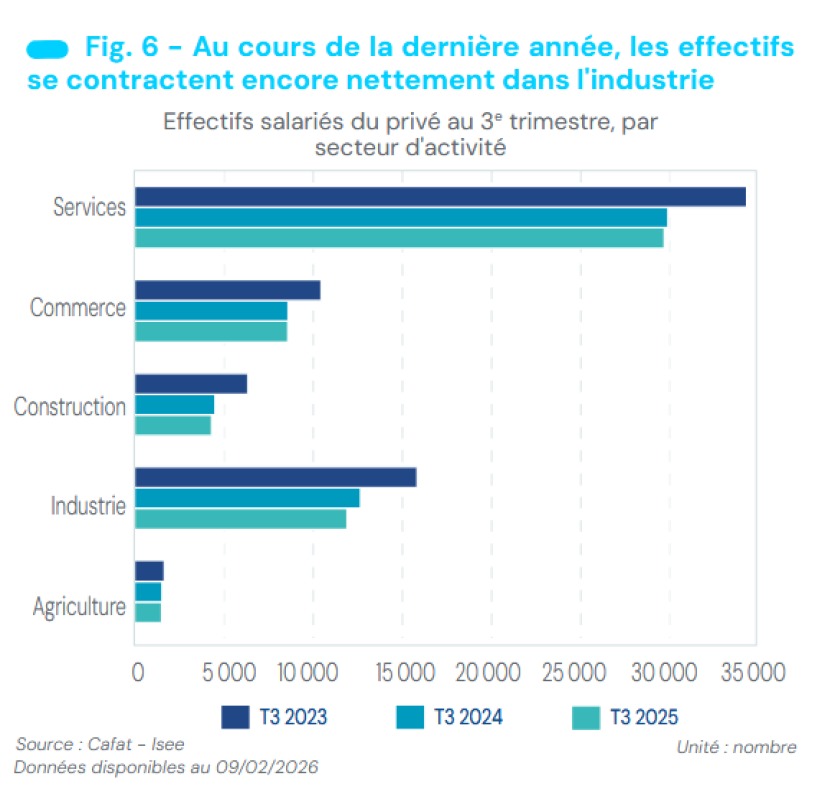 Malgré ce léger mieux, les pertes enregistrées depuis 2024 continuent de peser. À tel point que le niveau d’emploi salarié est désormais revenu à celui observé avant 2009, souligne l’Isee, effaçant plus d’une décennie de progression.