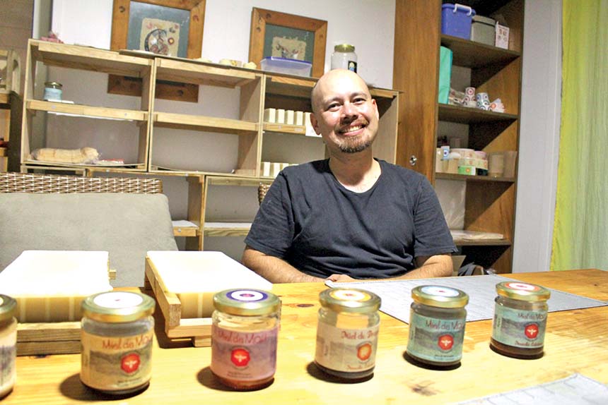 Frédéric Chatelain ouvre un à un ses pots de miel, trempe un testeur en bois dedans et raconte. Les fruits du dragon butinés aux petites heures du matin, la pointe iodée du miel de bord de mer. La dégustation se transforme en ode à la biodiversité calédonienne. « L’idée est de valoriser chaque nectar selon les différents terroirs du territoire ». Frédéric Chatelain, ancien gérant d’hôtel, s’est reconverti dans l’apiculture il y a cinq ans. « L’odeur de la cire fraîche a été le déclencheur ». En 2014, il installe trois ruches sur un terrain familial de 150 hectares sur les flancs du mont Mou. Aujourd’hui il en a une dizaine, pour une production annuelle de miel de 400 litres, doublée d’une fabrication de 600 savons, fruit de la passion d’un autre entrepreneur. « De deux personnes au début de l’aventure, nous sommes trois familles engagées maintenant, et tous des reconvertis ». Tourné vers le marché japonais, la Forêt de Mou a utilisé le trophée pour se créer une belle représentation sur le marché nippon. « Mais c’est un marché difficile et on a voulu aller trop vite, reconnaît l’apiculteur, maintenant on se recentre sur le local pour repartir plus tard vers l’international ». Le projet 2019 : ouvrir une ferme au mont Mou, avec des champs de vanille, la miellerie et une savonnerie. « On vient d’obtenir le soutien de la BCI concernant le projet et on le pense 100 % agriculture raisonnée ». Autre projet : déposer un label pour le miel calédonien, « pour que ses saveurs uniques au monde soient protégées », conclut Frédéric Chatelain, apiculteur-poète.