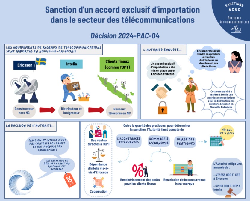 Un accord exclusif d’importation affecte l’économie.C’est en décembre 2024 que l’ACNC a prononcé la sanction financière la plus importante depuis sa création en 2018 : 479 millions de francs. "Pour donner un ordre d’idée, si on cumule toutes les sanctions en sept ans, cela représente entre 300 et 350 millions de francs", compare Stéphane Retterer, président de l’Autorité. Cette décision vient sanctionner un accord exclusif d’importation mis en place entre les sociétés Ericsson et Intelia. Or, ce type d'accord est interdit depuis 2014 en Nouvelle-Calédonie, rappelle Stéphane Retterer. Il a permis de renchérir les prix des produits vendus par Ericsson via son importateur exclusif à l’OPT. "L’Office avait des prix plus élevés d’environ 20 %. Évidemment, cela se répercute sur le consommateur." Les faits ont été reconnus par les deux parties prenantes et un appel est en cours.