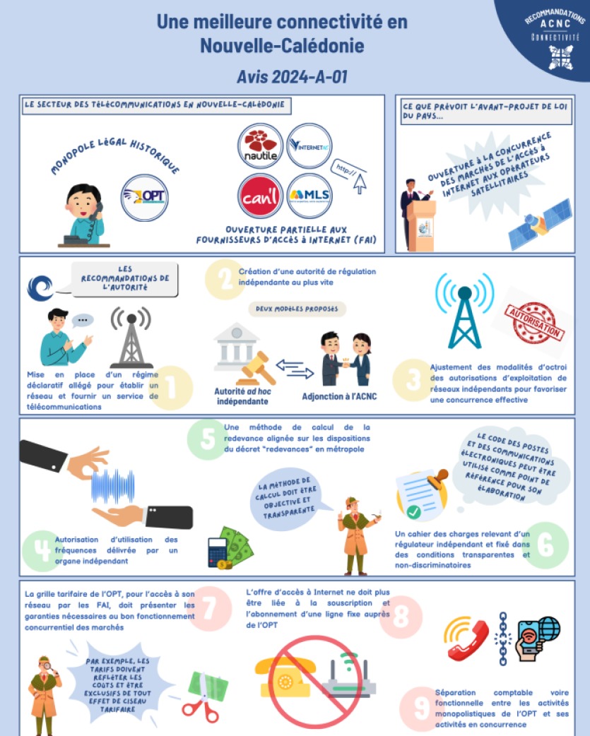 Ce projet de loi de pays est attendu d’ici à la fin du semestre, estime Stéphane Retterer. L’organisme travaille avec le gouvernement afin de mettre en place une régulation indépendante des télécommunications. En 2025, l’idée est de réguler le marché des fournisseurs d’accès à Internet en Nouvelle-Calédonie, au nombre de cinq, pour qu’ils "proposent des prix plus compétitifs et une qualité de prestations plus élevée". L’ACNC explique la démarche sous forme de dessins explicatifs.