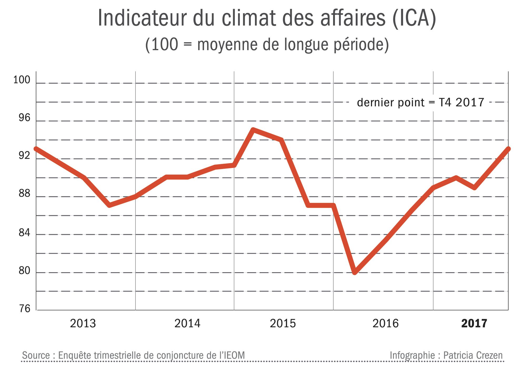 - ÉCONOMIE. L’institut d’émission d’outre-mer vient de publier son rapport sur la conjoncturedu 4e trimestre 2017. Si un regain de confiance est observé, d’autres données sont moins réjouissantes.Un nouveau regain de confiance L’indicateur du climat des affaires progresse de 2,1 points, retrouvant son niveau de mi-2015, avant la crise du nickel. Il s’établit ainsi à 92,9 points, soit toujours en deçà de sa moyenne de longue période, traduisant le ralentissement de l’économieIl vous reste 90% de l'article à découvrir.Cet article est réservé aux abonnés.