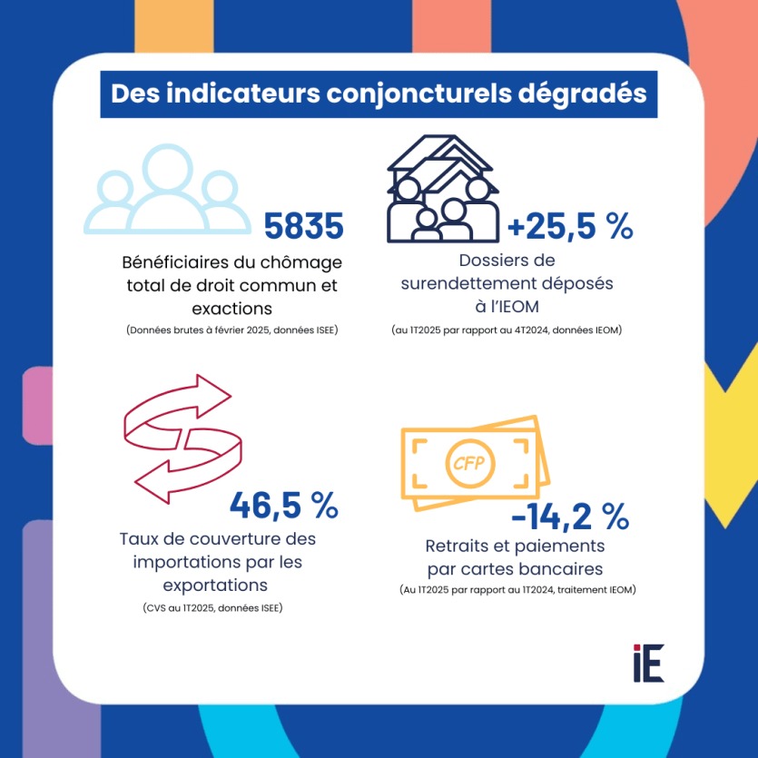 Infographie IEOMQuant aux prêts individuels et aux crédits à la consommation, ils baissent également nettement (-28,6 %), tout comme les crédits à l’habitat (-40,8 %). La fragilité économique des ménages calédoniens s’observe également dans les "indicateurs de vulnérabilité" : les incidents de remboursement des crédits aux particuliers ont augmenté de 5,5 % au premier trimestre, tandis que le nombre de dossiers de surendettement a explosé, avec +268,8 % en un an.