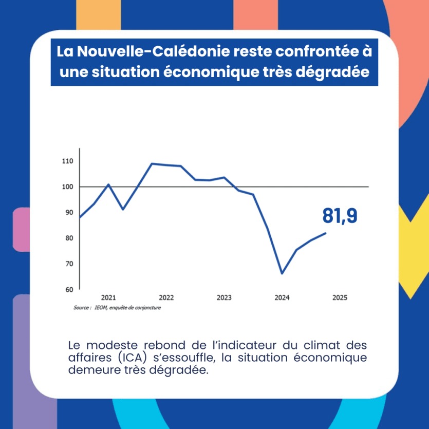 À quand une sortie de crise pour l’économie calédonienne ? Plus d’un an après les émeutes de mai 2024, la Nouvelle-Calédonie est toujours confrontée à un climat très dégradé. C’est ce que confirme la dernière note de l’Institut d’émission d’outre-mer (IEOM) sur le premier trimestre de l'année, publiée vendredi 6 juin, et qui met en lumière une situation économique encore très affectée par la crise insurrectionnelle. Pourtant, après un plus bas historique enregistré au deuxième trimestre 2024, l’indice du climat des affaires (ICA) affiche un léger rebond ces derniers mois (+2,7 % au premier trimestre 2025). Rien qui puisse s’interpréter comme une reprise économique, tempère toutefois l’IEOM, mais plutôt comme une stabilisation "à un niveau particulièrement dégradé". Le timide redressement de l’activité de certaines entreprises n’empêche pas, en effet, une opinion générale de stagner à un niveau particulièrement bas. À l’horizon de 12 mois, 32 % des entreprises disent craindre une défaillance.