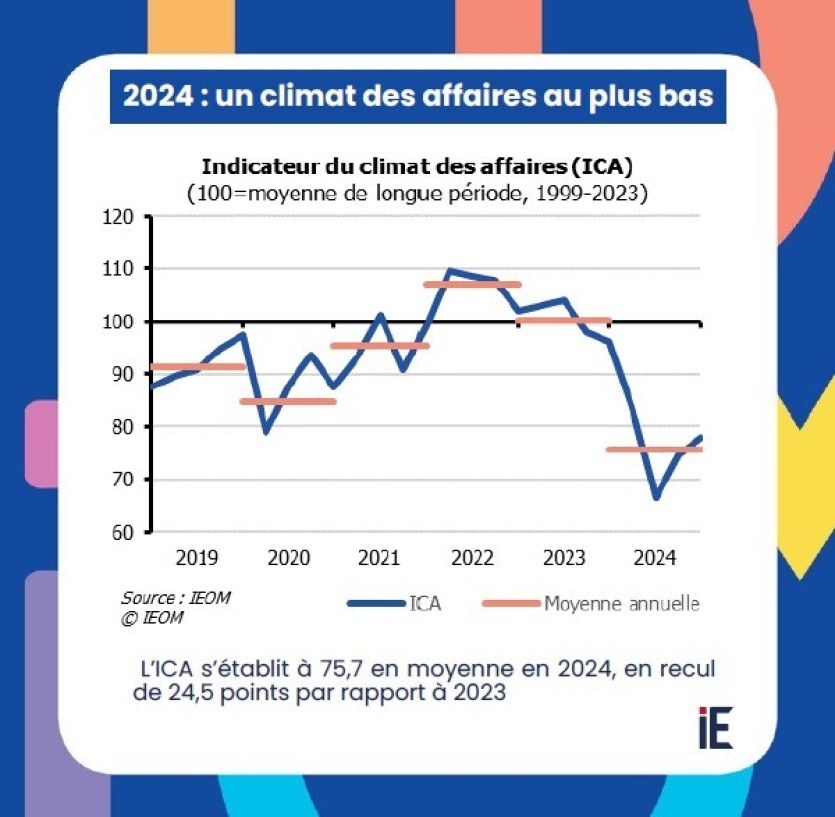Infographie IEOMLa crise du nickel et les tensions politiques avaient déjà participé à son effritement, début 2024. Mais les émeutes ont provoqué une "chute historique" de l’indicateur du climat des affaires (ICA), observe l’IEOM. L’ICA s’établit à 75,7 en moyenne en 2024, en recul de 24,5 points par rapport à 2023. Un plus bas jamais atteint auparavant. Une timide reprise a toutefois été constatée au dernier trimestre 2024, il demeure à un niveau particulièrement faible, encore inférieur à celui atteint début 2020, lors de la pandémie de Covid-19.