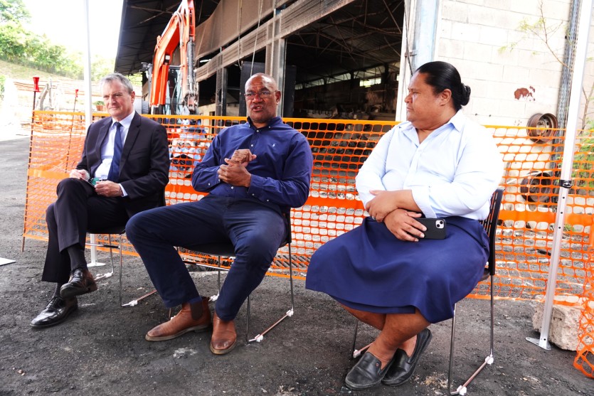 Le haussaire, Jacques Billant, le président du gouvernement, Alcide Ponga, et le membre du gouvernement en charge de la construction, Petelo Sao, ont convié la presse à Doniambo, ce vendredi 5 décembre. Photo Anthony TejeroUn lieu "symbolique" pour le président du gouvernement, Alcide Ponga : "Tous ces chantiers qu’on commence, c’est vraiment de l’essence qu’on remet dans la machine pour que l’économie puisse redémarrer", estime le chef de l’exécutif, selon qui ces travaux vont également redonner des couleurs au secteur du BTP, particulièrement frappé par la crise. "Quand on remet de l’argent dans l’économie, on réalimente aussi les ressources fiscales de la Nouvelle-Calédonie, les commerces parce que ce sont autant de travailleurs qui vont toucher des salaires, consommer et donc payer de la TGC. Ce sont aussi des entreprises qui vont payer des cotisations sociales, cotiser pour la retraite."
