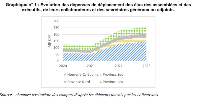 En 2022 et 2023, ces frais sont 16 % plus élevés qu’en 2019. À titre de comparaison, c’est cinq fois plus qu’en Polynésie française. Sur ces deux années, les frais de déplacement du Congrès et du gouvernement s’élèvent respectivement à 62 millions et 56 millions par an.