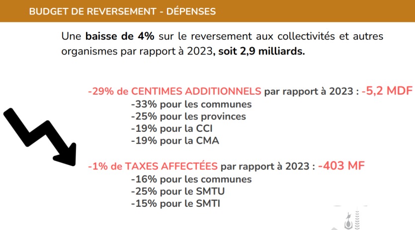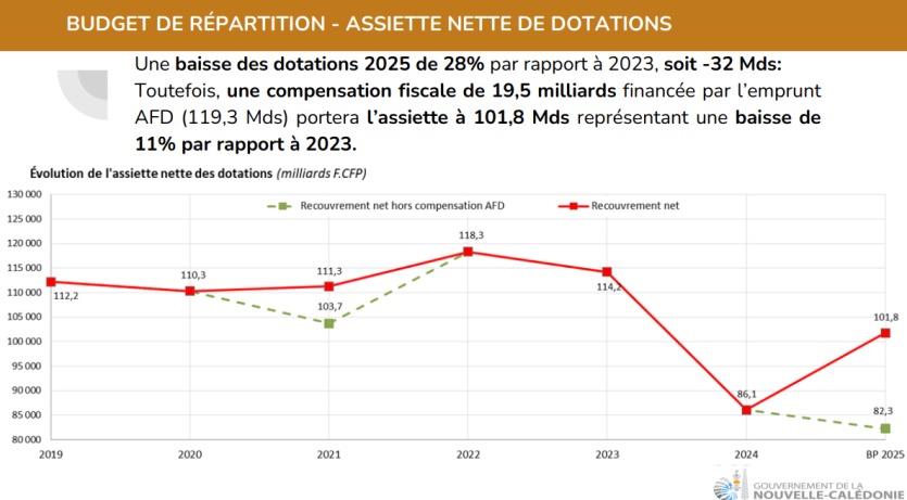 Ce budget est réparti entre les collectivités territoriales, provinces, communes et Nouvelle-Calédonie. L’assiette de répartition s’élève à 101,8 milliards de francs grâce à une compensation fiscale du prêt garanti par l’État d’un montant de 19,5 milliards. Sinon, elle serait de 82,3 milliards. Les dotations ont dégringolé en 2024, de 114,2 à 86,1 milliards de francs.