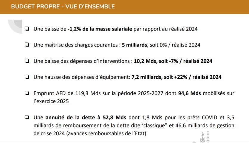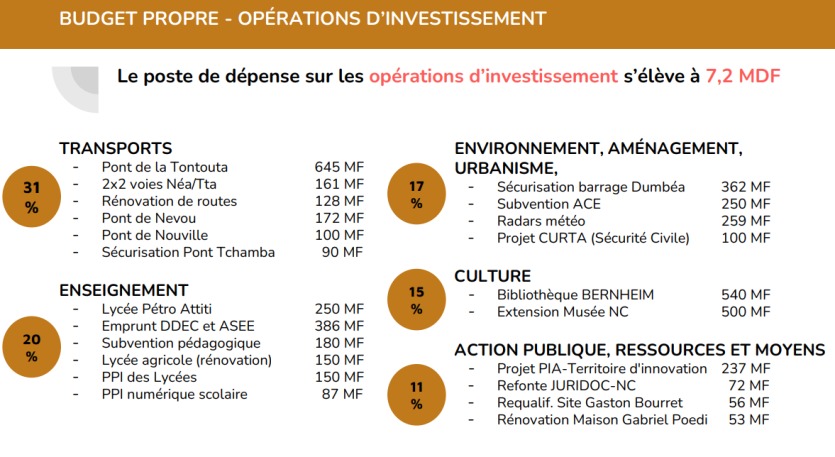 Le budget propre de la Nouvelle-Calédonie finance le fonctionnement général des services et des institutions (gouvernement, Congrès, Autorité de la concurrence, Sénat coutumier, etc.). "Les dépenses réelles s’élèvent à 46-47 milliards, fonctionnement et investissement confondus, ce qui est inférieur à ce dont la Nouvelle-Calédonie bénéficiait jusqu’à maintenant", explique Thierry Santa, membre du gouvernement en charge du budget. Parmi les points notables, la poursuite de la baisse des dépenses de fonctionnement, un travail entamé par la Nouvelle-Calédonie depuis plusieurs années, "face à la crise qui existait déjà avant le mois de mai, développe Thierry Santa, contrairement aux idées reçues". Les charges courantes sont passées de 7,7 à 5 milliards de francs depuis 2019. Le gouvernement prévoit de poursuivre dans cette voie dans les années à venir.