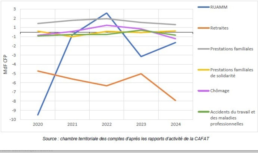 Quant à la situation des comptes sanitaires et sociaux, celle-ci "se dégrade encore un peu plus en 2024", souligne la CTC. "Tous les régimes sociaux gérés par la Cafat sont déficitaires en 2024, à l’exception du régime des prestations familiales", indique la Chambre, appelant à "de nouvelles réformes".